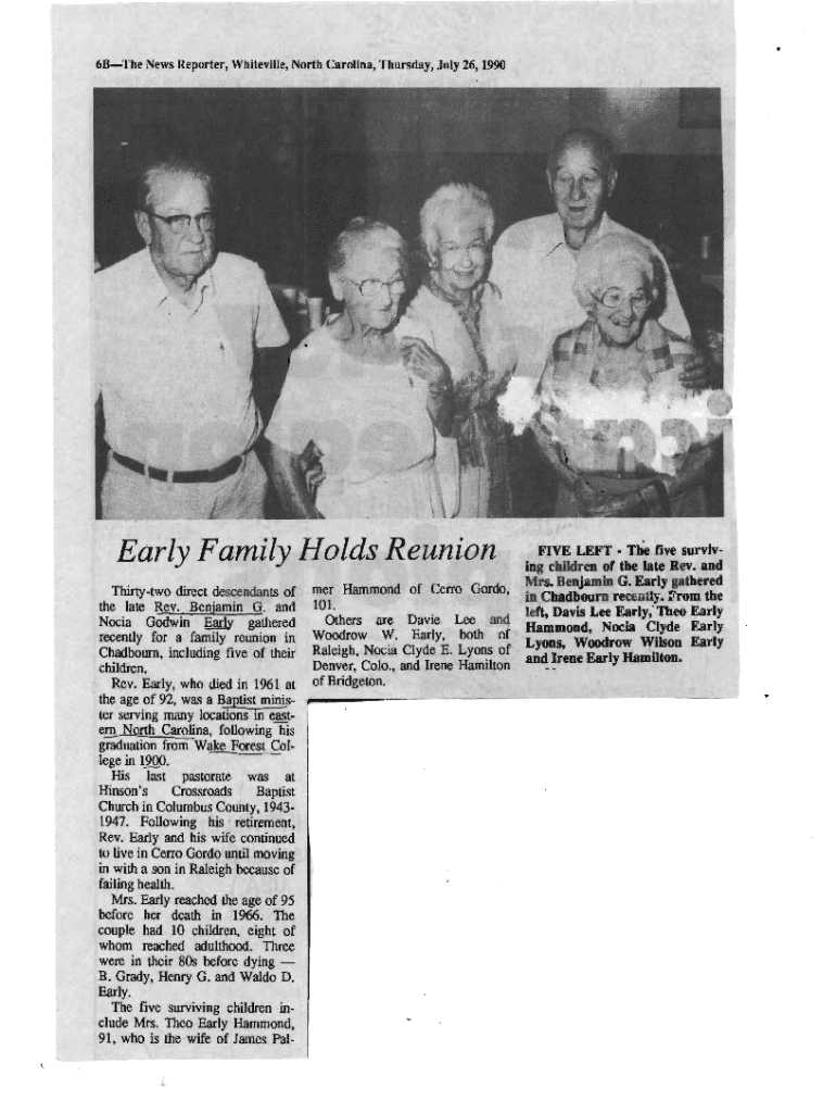 6BThe News Reporter, WhitevlJle, North Carolina, Thursday, July 26,1990Early Family Holds ReunionThirtytwo direct descendants of