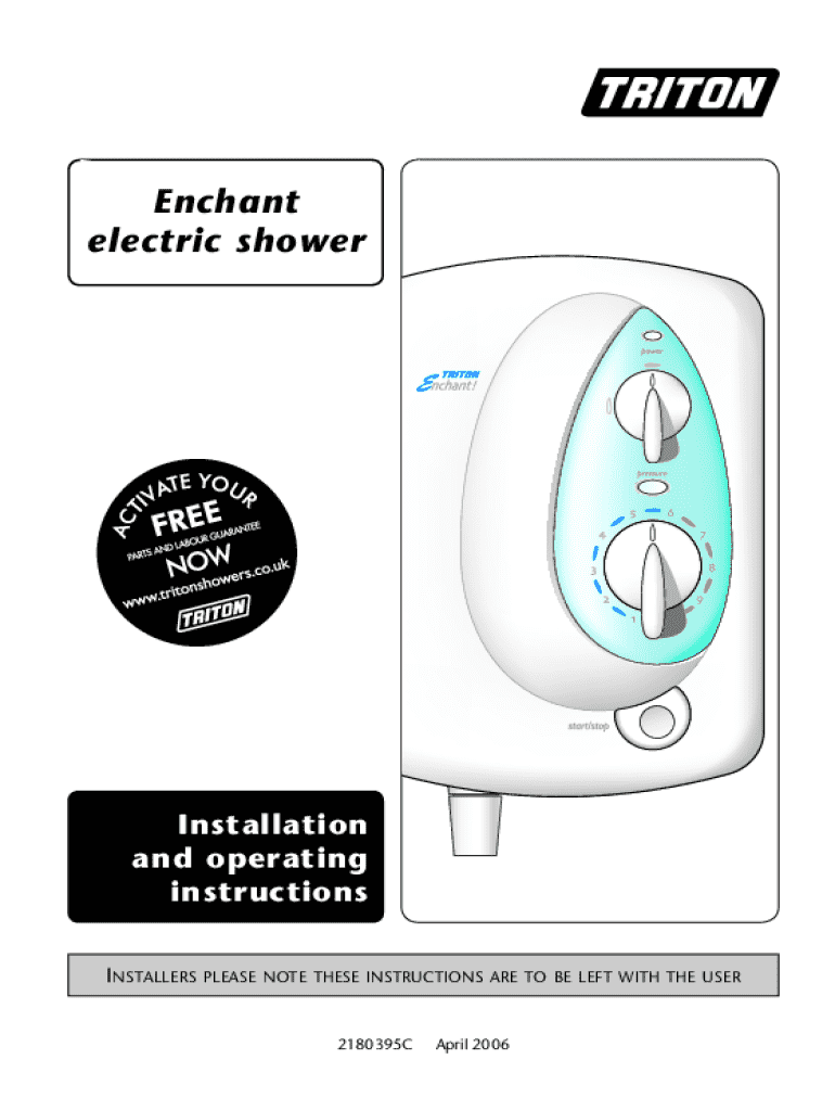 Enchant electric showerInstallation and operating instructions Installersplease note these instructions are to be left with the user2180395CApril 2006EnchantCONTENTSPageImportant safety information1Introduction2Specifications2Advice