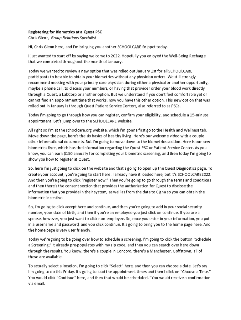 Registering for Biometrics at a Quest PSC Chris Glenn, Group Relations Specialist Hi, Chris Glenn here, and I\'m bringing you another SCHOOLCARE Snippet today. I just wanted to start off by saying
