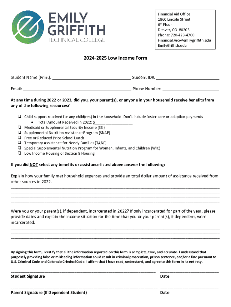 Financial Aid Office 1860 Lincoln Street 6th Floor Denver, CO 80203 Phone: 7204234700 Financial.Aid@emilygriffith.edu EmilyGriffith.edu20242025 Low Income Form Student Name (Print): ___ Student ID#: