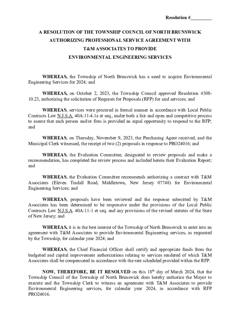 Resolution #___ A RESOLUTION OF THE TOWNSHIP COUNCIL OF NORTH BRUNSWICK AUTHORIZING PROFESSIONAL SERVICE AGREEMENT WITH T&M ASSOCIATES TO PROVIDE ENVIRONMENTAL ENGINEERING SERVICESWHEREAS, the Township