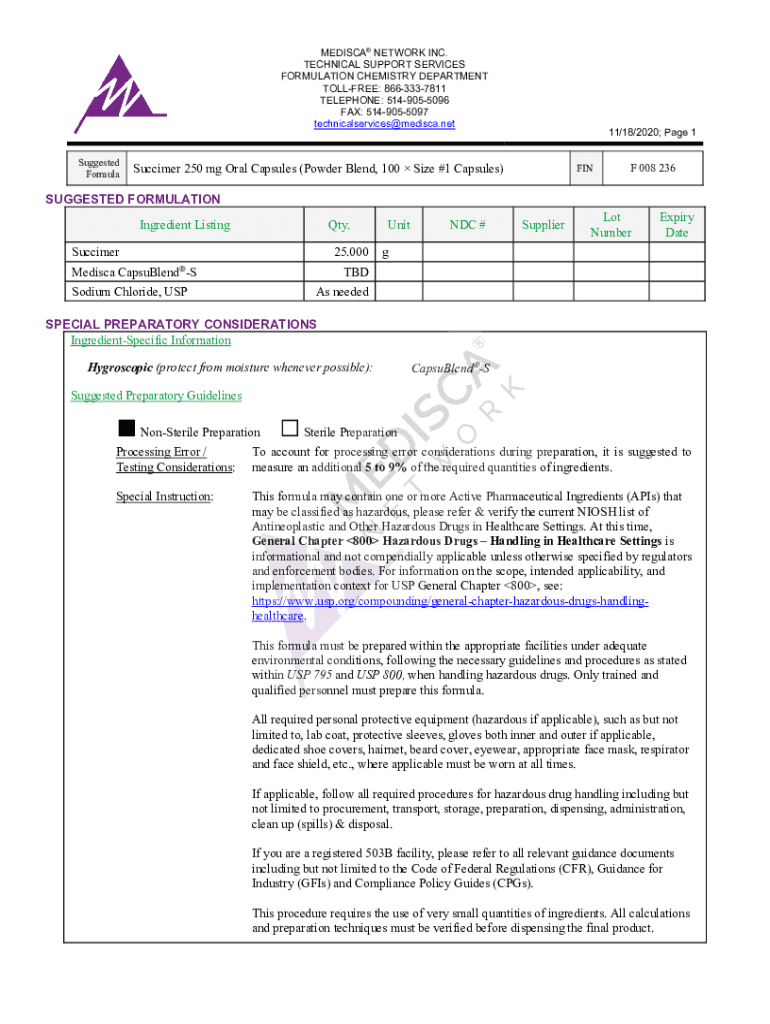 MEDISCA NETWORK INC. TECHNICAL SUPPORT SERVICES FORMULATION CHEMISTRY DEPARTMENT TOLLFREE: 8663337811 TELEPHONE: 5149055096 FAX: 5149055097 technicalservices@medisca.netSuggested Formula11/18/2020;
