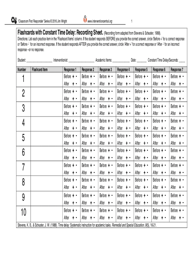 Classroom First Responder Series 2016 Jim Wright.intervention central.org1Flashcards with Constant Time Delay: Recording Sheet. (Recording form adapted from Stevens & Schuster, 1988).