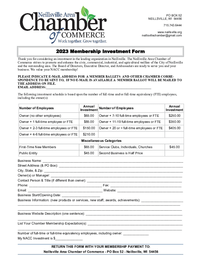 PO BOX 52 NEILLSVILLE, WI 54456 715.743.6444 www.neillsville.org neillsvillechamber@gmail.com2023 Membership Investment Form Thank you for considering an investment in the leading organization in