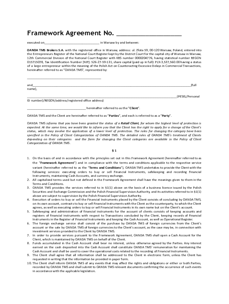 Framework Agreement No. ___ executed on___ in Warsaw by and between: OANDA TMS Brokers S.A. with the registered office in Warsaw, address: ul. Zota 59, 00120 Warsaw, Poland, entered into the Entrepreneurs