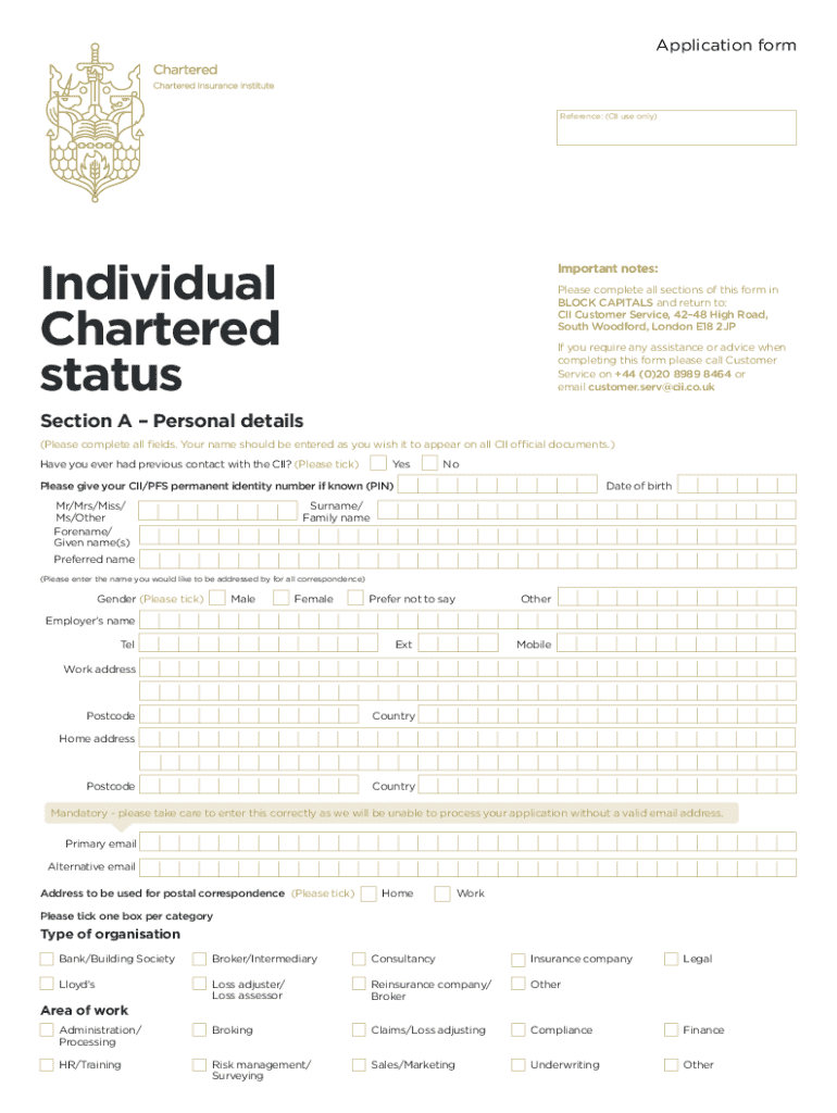 Application formReference: (CII use only)Individual Chartered statusImportant notes: Please complete all sections of this form in BLOCK CAPITALS and return to: CII Customer Service, 4248 High Road,