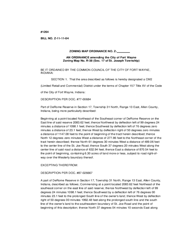 #1264 BILL NO. Z111104ZONING MAP ORDINANCE NO. ZAN ORDINANCE amending the City of Fort Wayne Zoning Map No. R38 (Sec. 17 of St. Joseph Township) BE IT ORDAINED BY THE COMMON COUNCIL OF THE CITY OF