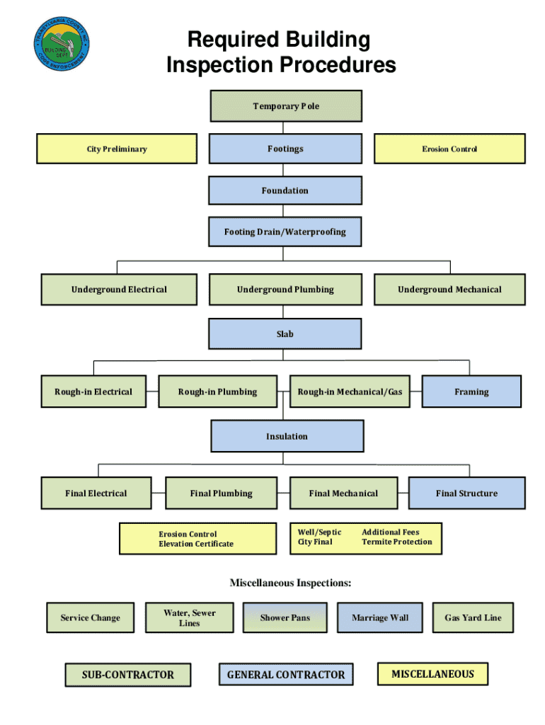 Required Building Inspection Procedures Temporary PoleFootingsCity PreliminaryErosion ControlFoundationFooting Drain/WaterproofingUnderground ElectricalUnderground PlumbingUnderground MechanicalSlabRoughin