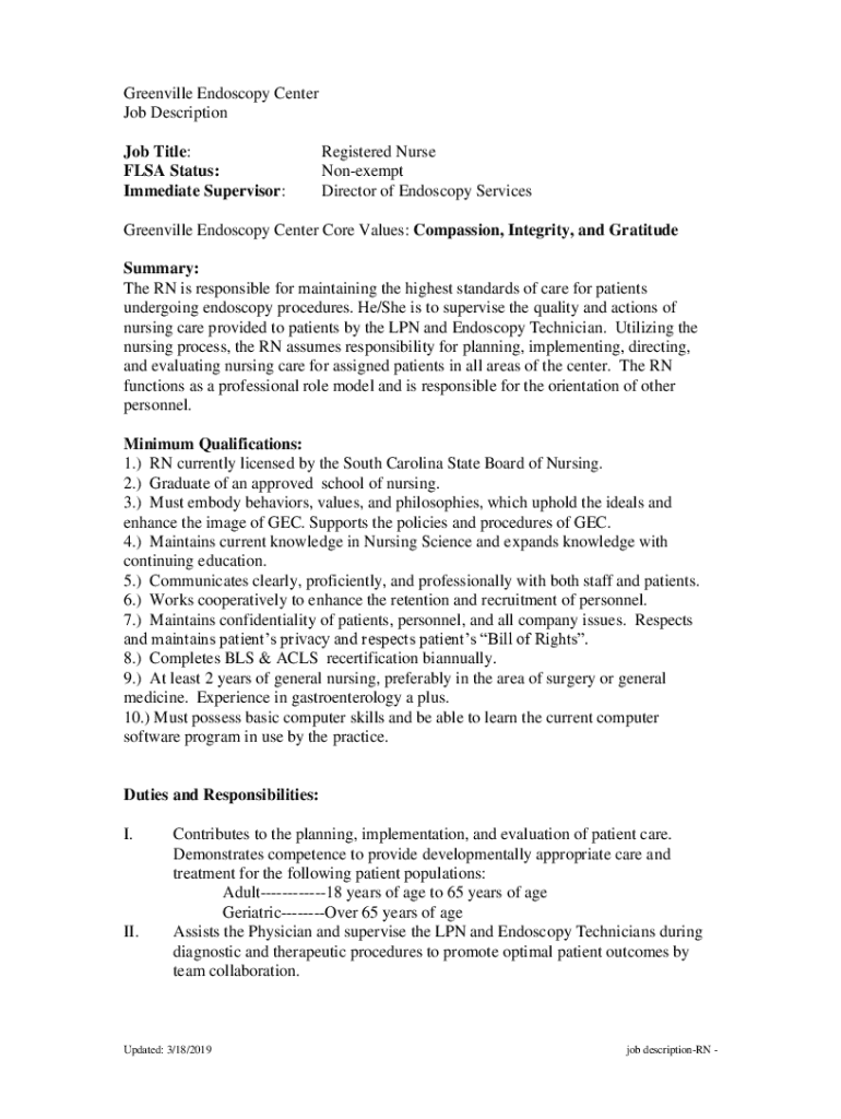 Greenville Endoscopy Center Job Description Job Title: FLSA Status: Immediate Supervisor:Registered Nurse Nonexempt Director of Endoscopy ServicesGreenville Endoscopy Center Core Values: Compassion,