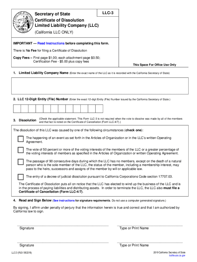 Instructions for Completing the Certificate of Dissolution (Form LLC3) (California LLC ONLY) To put all on notice that the California limited liability company (LLC) has elected to wind up the business