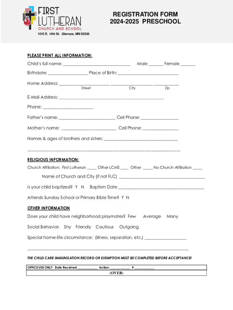 REGISTRATION FORM 20242025 PRESCHOOL 1015 E. 14th St. Glencoe, MN 55336PLEASE PRINT ALL INFORMATION: Childs full name: ___Male ___ Female ___Birthdate: ___ Place of Birth: ___ Home Address: ___ ___