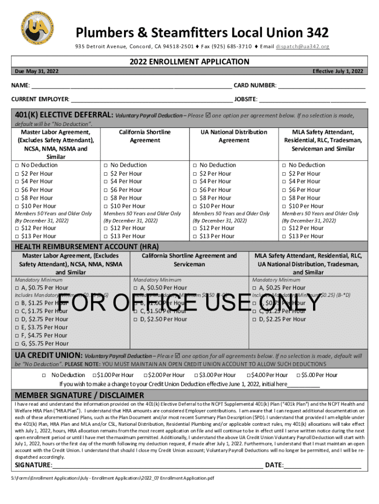 Plumbers & Steamfitters Local Union 342935 Detroit Avenue, Concord, CA 945182501 Fax (925) 6853710 Email dispatch@ua342.org2022 ENROLLMENT APPLICATIONDue May 31, 2022Effective July 1, 2022NAME: ___