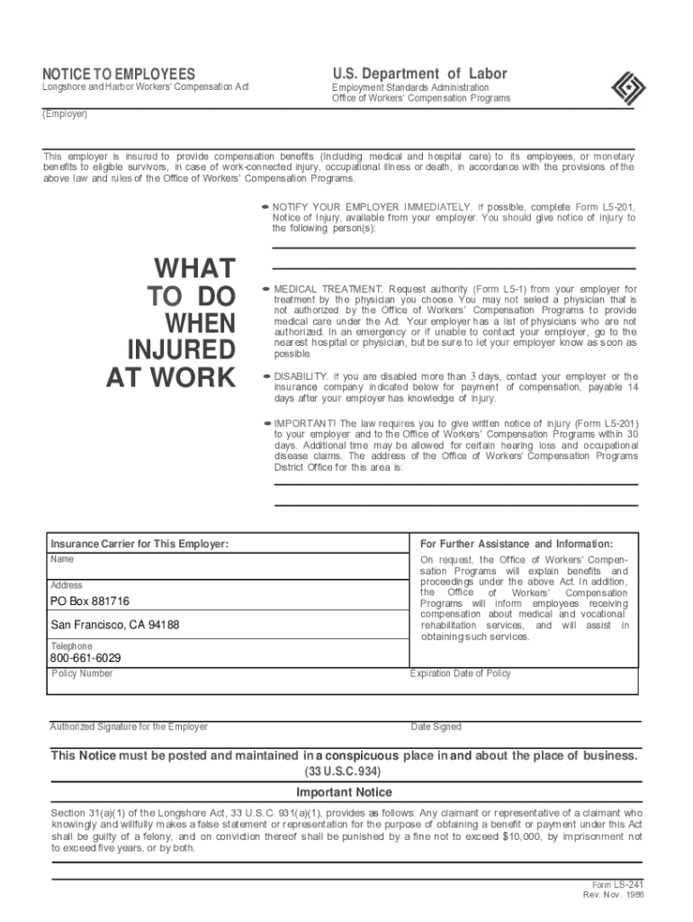 To fill out the U.S. Longshore and Harbor Workers' Compensation form, employers must provide details about the employee's injury, the circumstances surrounding the injury, and any medical treatment received, alongside necessary identification and employer information.