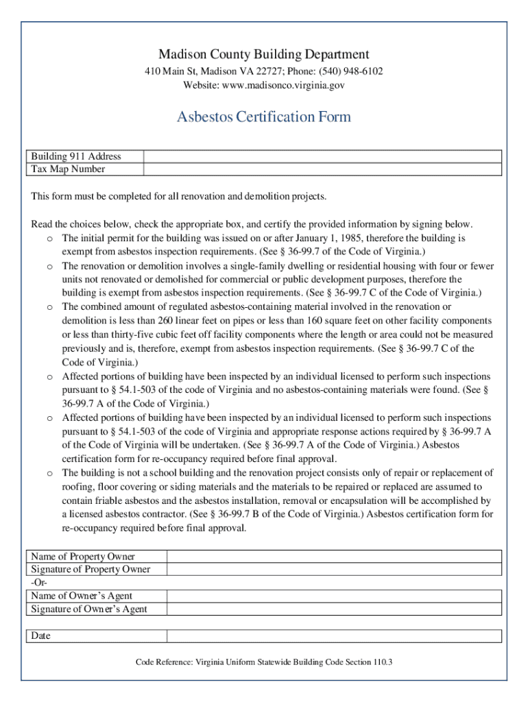 Get the free Asbestos Certification Form - Madison County, VA