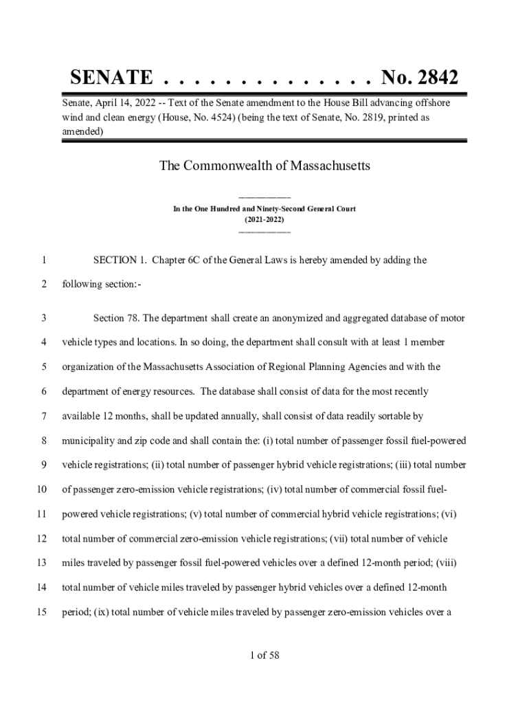 SENATE. . . . . . . . . . . . . . No. 2842 Senate, April 14, 2022, Text of the Senate amendment to the House Bill advancing offshore wind and clean energy (House, No. 4524) (being the text of Senate,