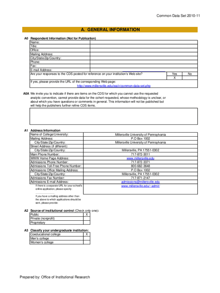 Common Data Set 201011A. GENERAL INFORMATION A0 Respondent Information (Not for Publication) Name: Title: Office: Mailing Address: City/State/Zip/Country: Phone: Fax: Email Address: Are your responses