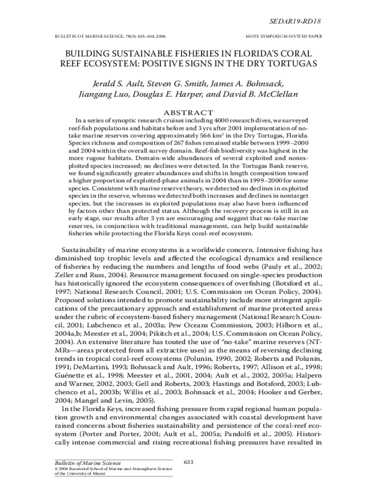 BULLETIN OF MARINE SCIENCE, 78(3): 633654, 2006MOTE SYMPOSIUM INVITED OVERBUILDING SUSTAINABLE FISHERIES IN FLORIDA CORAL