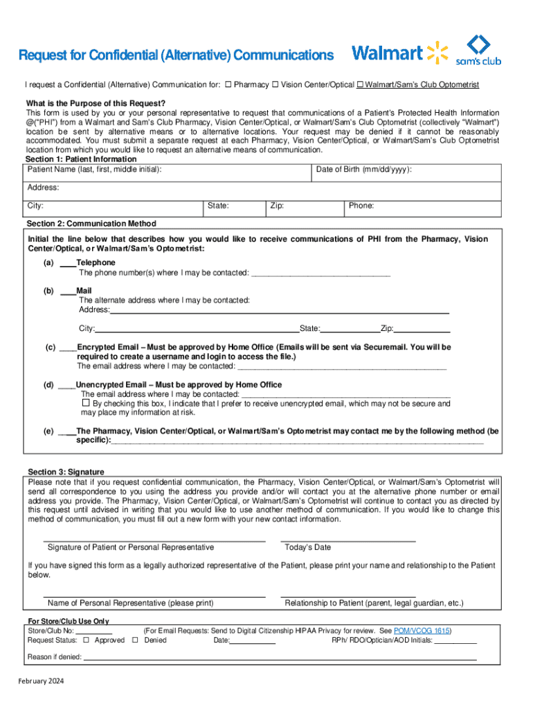 I request a Confidential (Alternative) Communication for: Pharmacy Vision Center/Optical Walmart/Sam's Club Optometrist