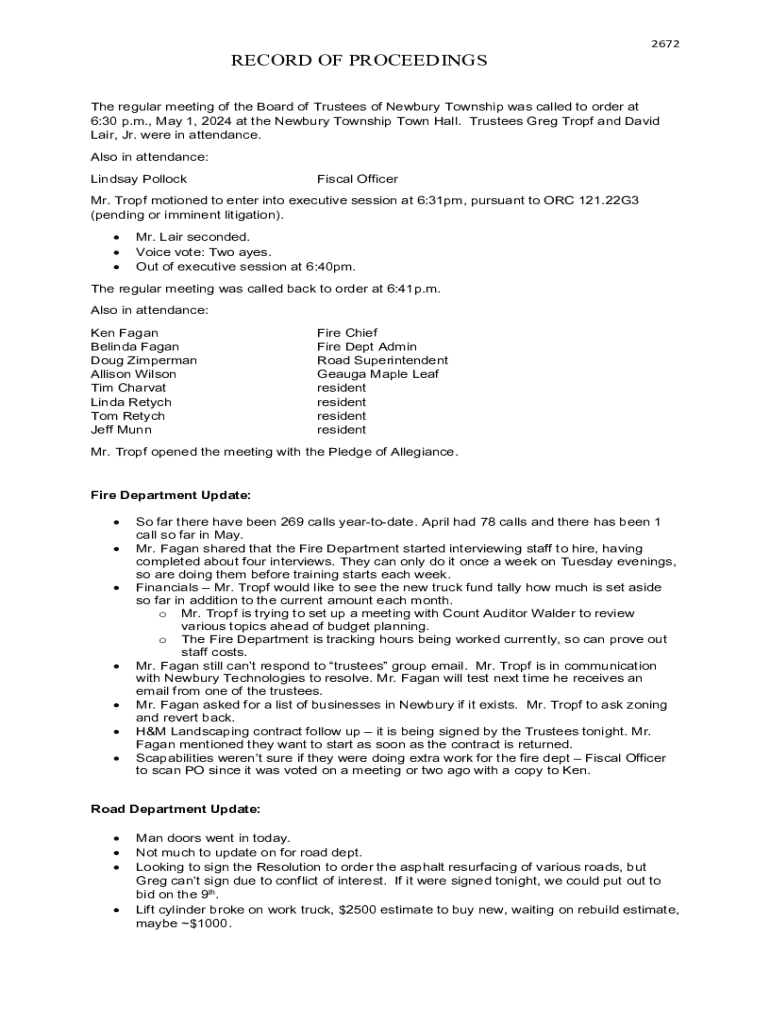 RECORD OF PROCEEDINGS2672The regular meeting of the Board of Trustees of Newbury Township was called to order at 6:30 p.m., May 1, 2024, at the Newbury Township Town Hall. Trustees Greg Trope and
