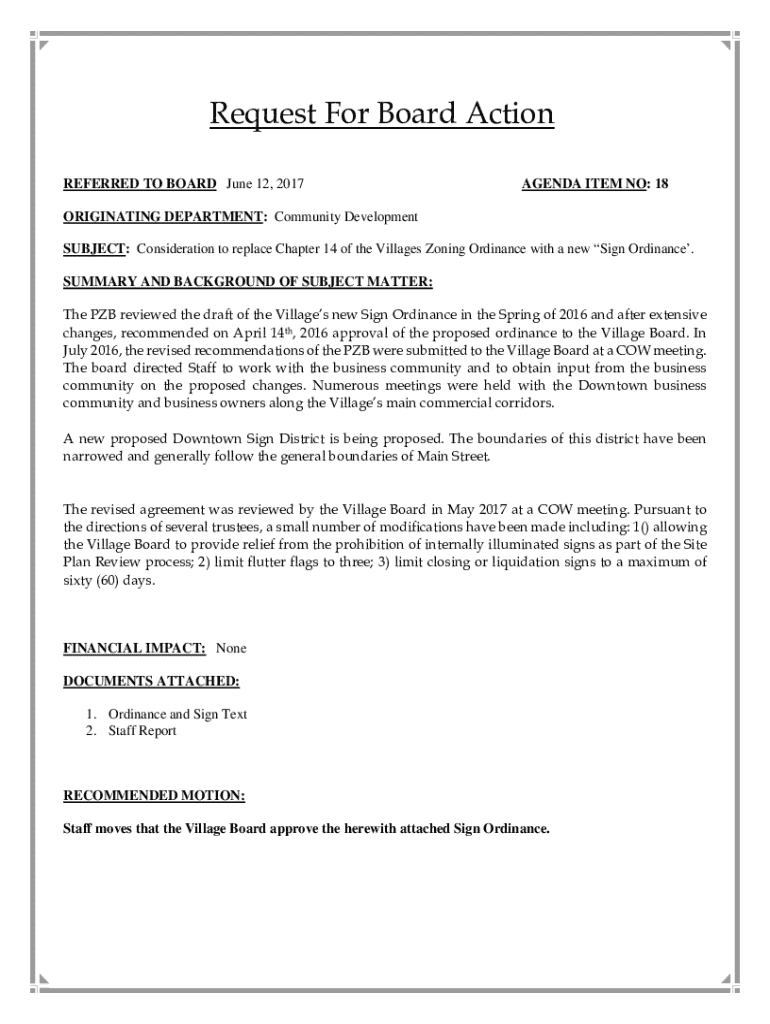 Request For Board Action REFERRED TO BOARD June 12, 2017AGENDA ITEM NO: 18ORIGINATING DEPARTMENT: Community Development SUBJECT: Consideration to replace Chapter 14 of the Villages Zoning Ordinance