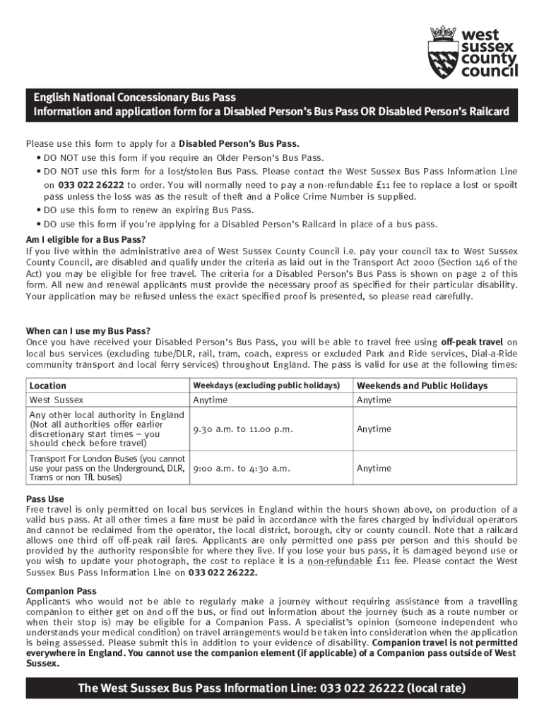 Information and application form for a Disabled Persons Bus Pass OR Disabled Persons Railcard