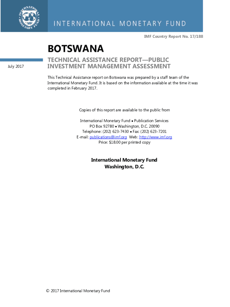 IMF Country Report No. 17/188BOTSWANA July 2017TECHNICAL ASSISTANCE REPORTPUBLIC INVESTMENT MANAGEMENT ASSESSMENT This Technical Assistance report on Botswana was prepared by a staff team of the International