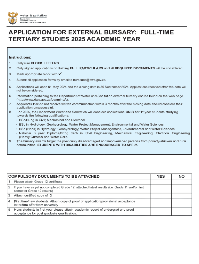 Edit application for external bursary. Add and replace text, insert new objects, rearrange pages, add watermarks and page numbers, and more. Click Done when you are finished editing and go to the Documents tab to merge, split, lock or unlock the file.