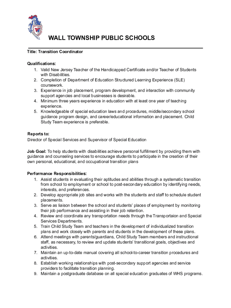 WALL TOWNSHIP PUBLIC SCHOOLS ___ Title: Transition Coordinator Qualifications: 1. Valid New Jersey Teacher of the Handicapped Certificate and/or Teacher of Students with Disabilities. 2. Completion