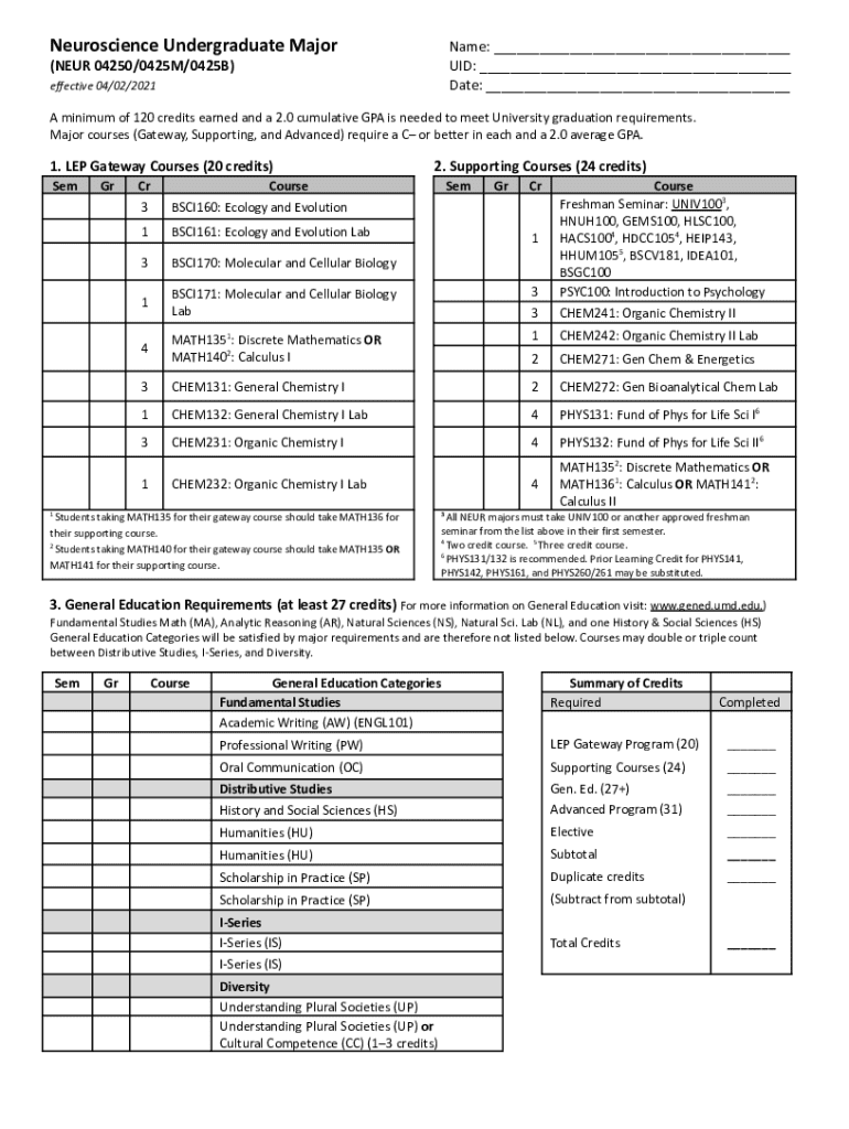 Get the free NEUR Degree Requirements Sheet 04/08/2021
