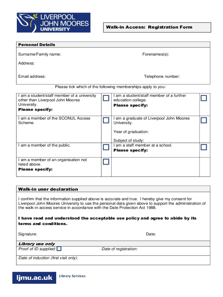 A walk-in access registration form is a document that allows individuals to register for in-person access to certain facilities, programs, or services.
