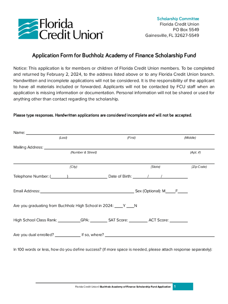 For Students of the Buchwald High School Academy of Financeflcu.orgFCUMKVS4520923FCU Buchwald Academy of Finance Scholarship Funds scholarship is