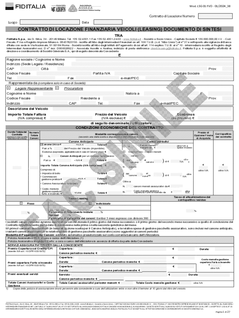 Mod. LSG 01 FVO 01/2024_38LuogoContratto di Locazione NumeroDataCONTRATTO DI LOCAZIONE FINANZIARIA VEICOLI (LEASING) DOCUMENTO DI SINTESI TRAFiditalia S.p.a., via G. Silva, 34 20149 Milano Tel. +39