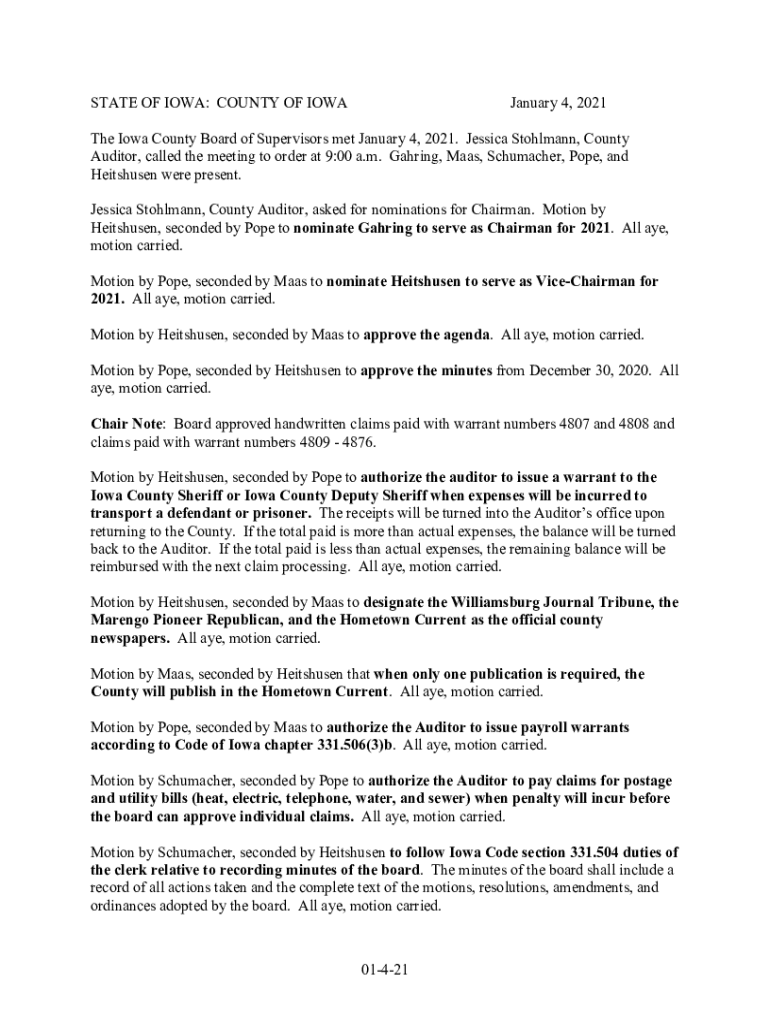 STATE OF IOWA: COUNTY OF IOWAJanuary 4, 2021The Iowa County Board of Supervisors met January 4, 2021. Jessica Schumann, County