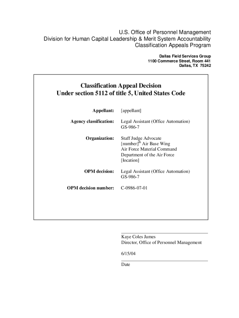 U.S. Office of Personnel Management Division for Human Capital Leadership & Merit System Accountability Classification Appeals Program Dallas Field Services Group 1100 Commerce Street, Room 441 Dallas,