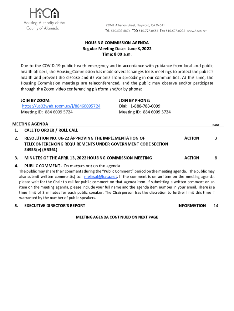HOUSING COMMISSION AGENDA Regular Meeting Date: June 8, 2022, Time: 8:00 a.m. Due to the COVID-19 public health emergency and in accordance with guidance from local and public health officers, the