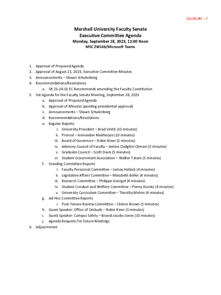 QUORUM 7Marshall University Faculty Senate Executive Committee Agenda Monday, September 18, 2023, 12:00 Noon MSC 2W16b/Microsoft Teams1. 2. 3. 4. Approval of Proposed Agenda Approval of August 21,