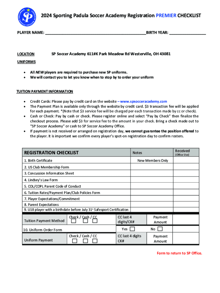 2024 Sporting Paula Soccer Academy Registration PREMIER CHECKLIST