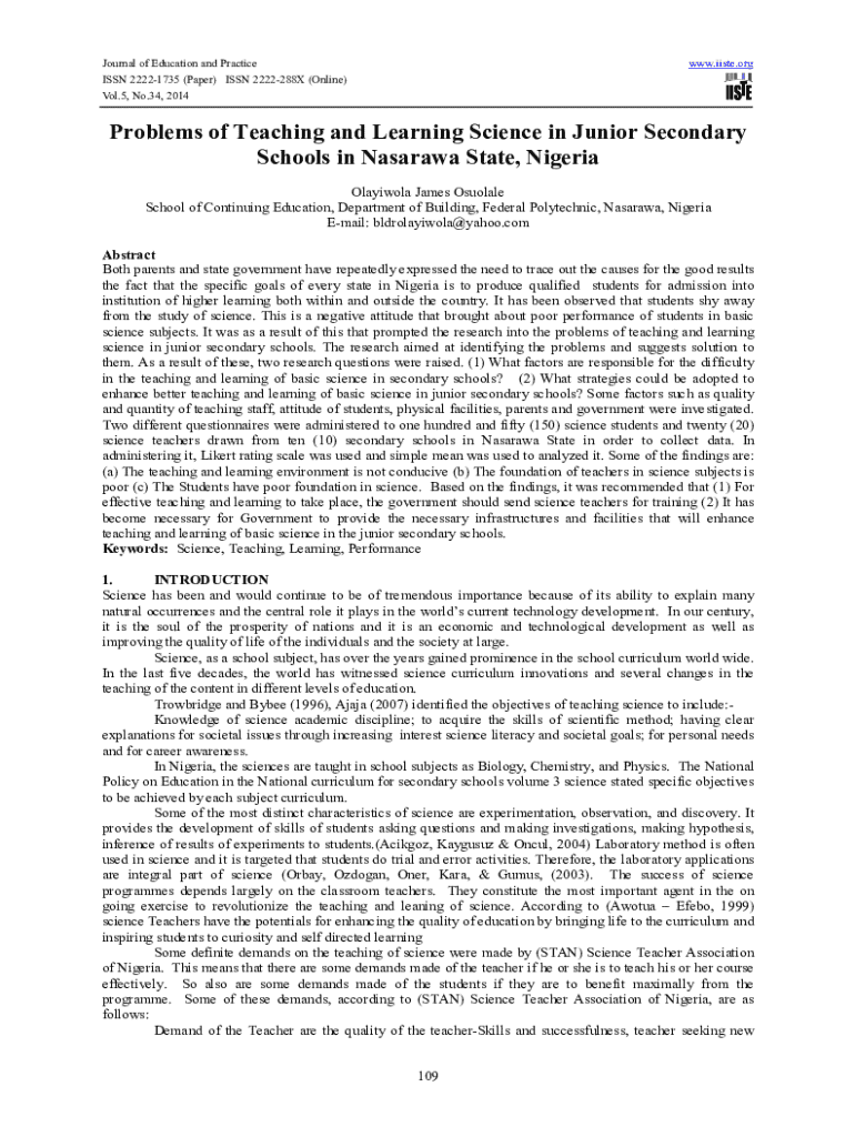 Vol.5, No.34, 2014www.piste.problems of Teaching and Learning Science in Junior Secondary