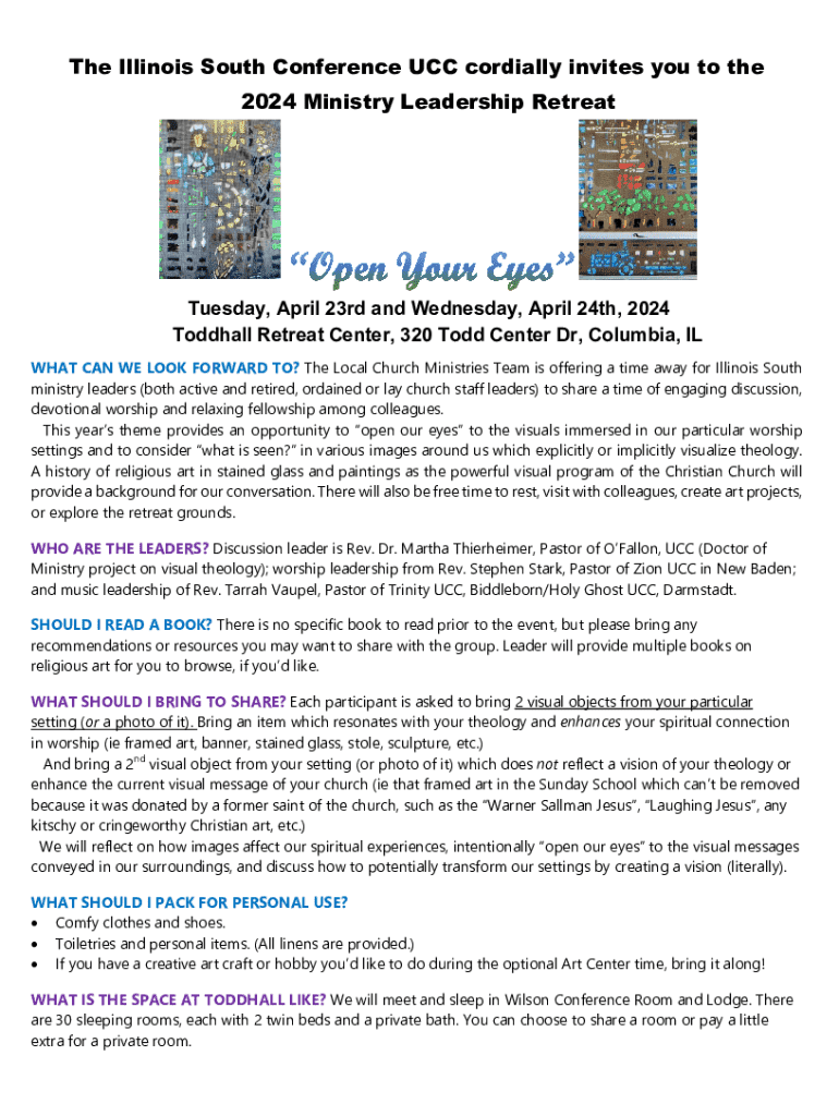The Illinois South Conference UCC cordially invites you to the 2024 Ministry Leadership Retreat Tuesday, April 23rd and Wednesday, April 24th, 2024 Todd hall Retreat Center, 320 Todd Center Dr, Columbia,