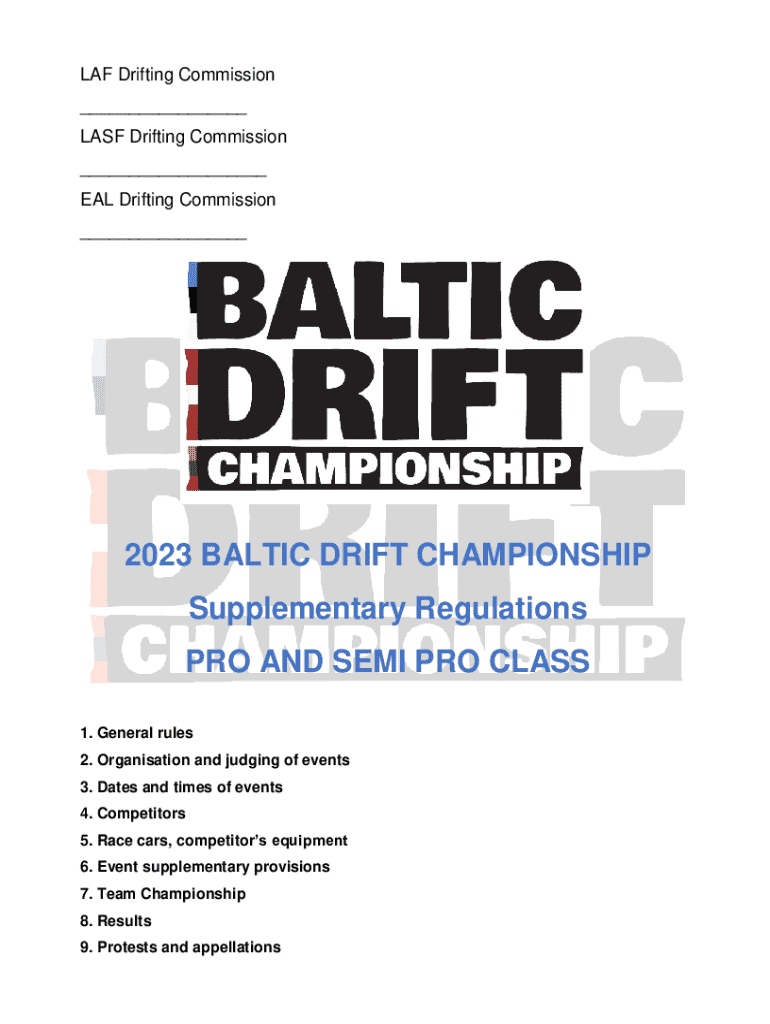 LAW Drifting Commission ___ LAST Drifting Commission ___ EAL Drifting Commission ___2023 BALTIC DRIFT CHAMPIONSHIP Supplementary Regulations PRO AND SEMI PRO CLASS 1. General rules 2. Organization