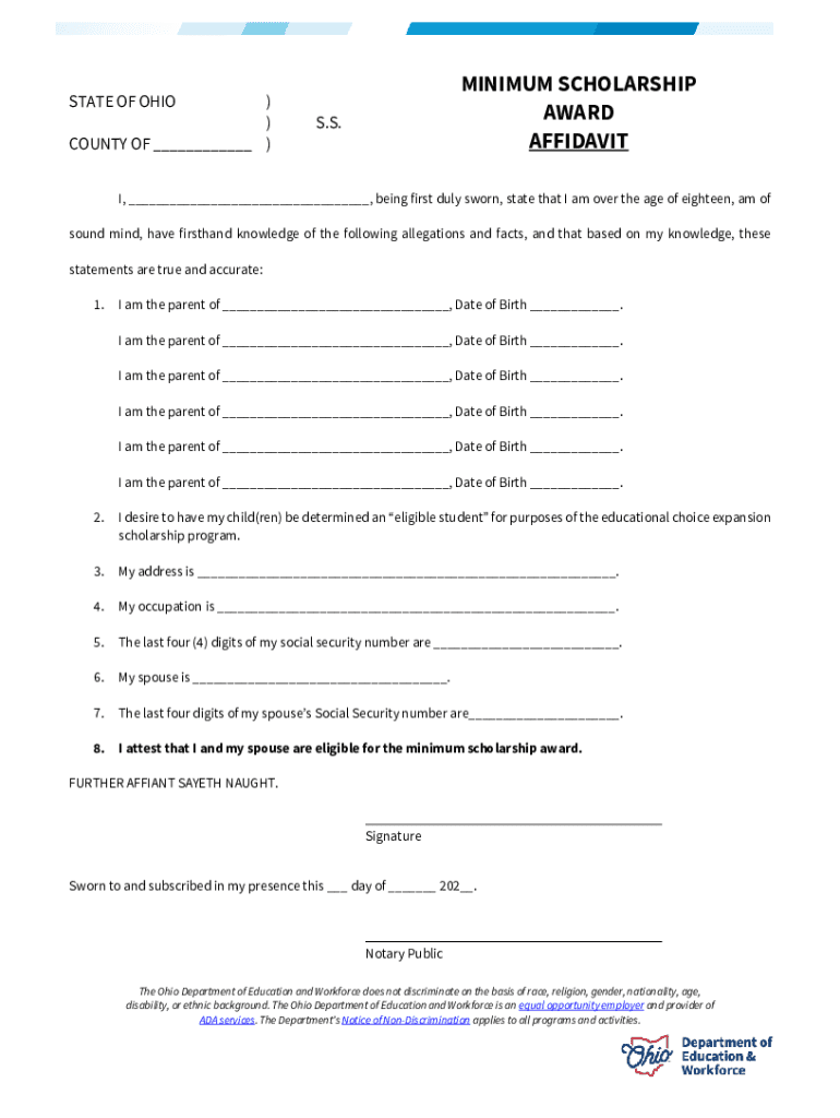 STATE OF OHIO) ) COUNTY OF ___ )MINIMUM SCHOLARSHIP AWARD AFFIDAVITS.S.I, ___, being first duly sworn, state that I am over the age of eighteen, am of sound mind, have firsthand knowledge of the following