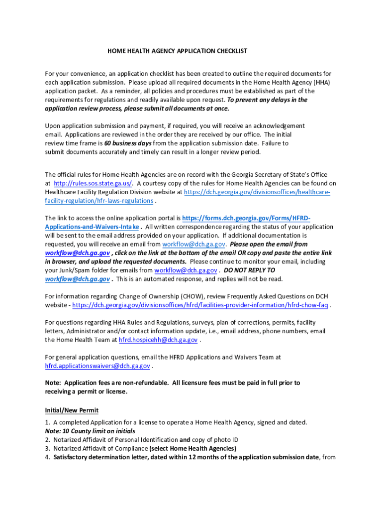 HOME HEALTH AGENCY APPLICATION CHECKLIST For your convenience, an application checklist has been created to outline the required documents for each application submission. Please upload all required