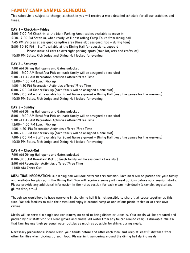 FAMILY CAMP SAMPLE SCHEDULE This schedule is subject to change, at check in you will receive a more detailed schedule for all our activities and times. DAY 1 Checkin Friday 5:007:00 PM Checkin at