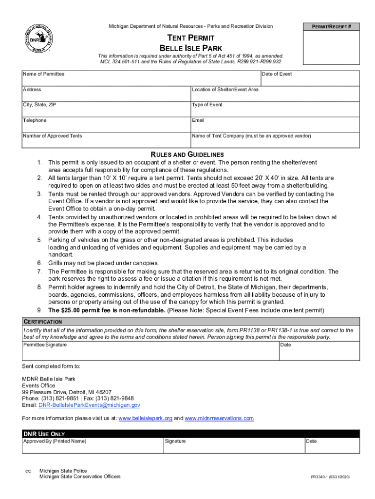 Michigan Department of Natural Resources Parks and Recreation DivisionPERMIT/RECEIPT #TENT PERMIT