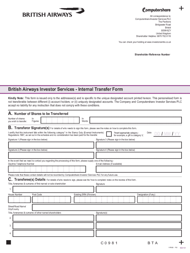 Get the free British Airways Investor Services - Internal Transfer Form B.