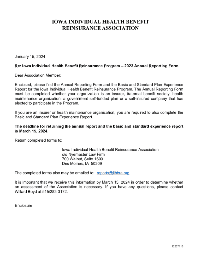 Re: Iowa Individual Health Benefit Reinsurance Program 2023 Annual Reporting Form