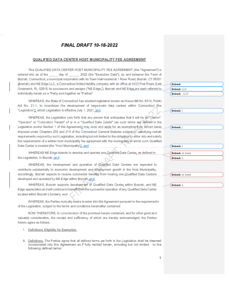 This QUALIFIED DATA CENTER HOST MUNICIPALITY FEE AGREEMENT (this \"Agreement\" is
