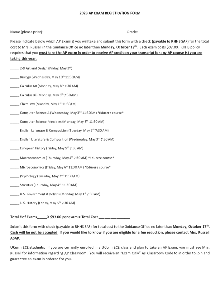 2023 AP EXAM REGISTRATION FORMName (please print): ___Grade: ___Please indicate below which AP Exam(s) you will take and submit this form with a check (payable to RHHS SAF) for the total