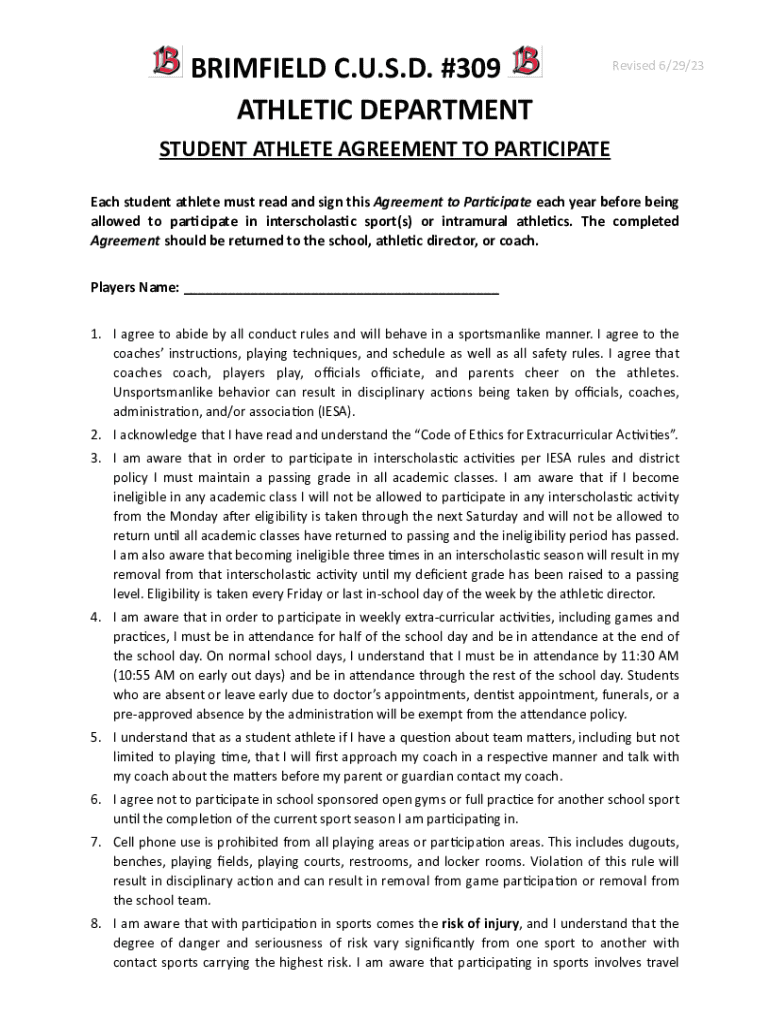 ATHLETIC DEPARTMENTRevised 6/29/23STUDENT ATHLETE AGREEMENT TO PARTICIPATE