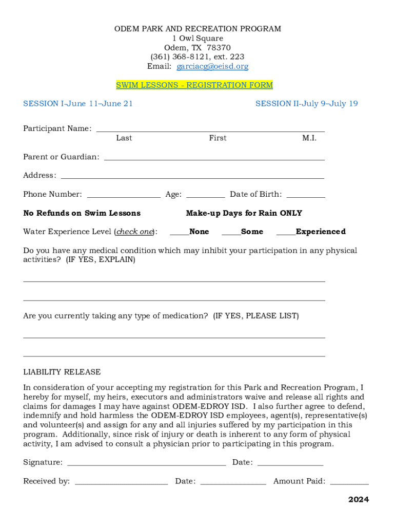 SWIM LESSONS REGISTRATION FORM